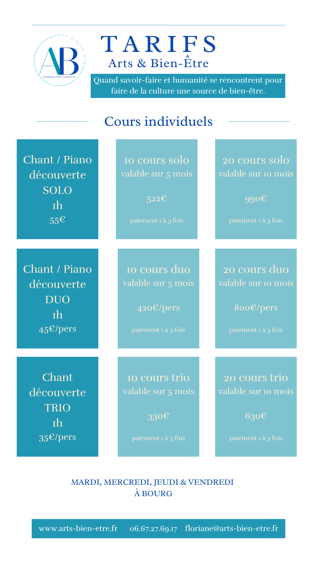 Chez Arts & Bien-Être, j’ai à cœur de proposer des séances accessibles et adaptées à chacun. Mes tarifs tiennent compte du temps passé, de la préparation en amont et de la qualité de l’accompagnement, qu’il s’agisse de cours de musique, de chant ou d’ateliers bien-être.