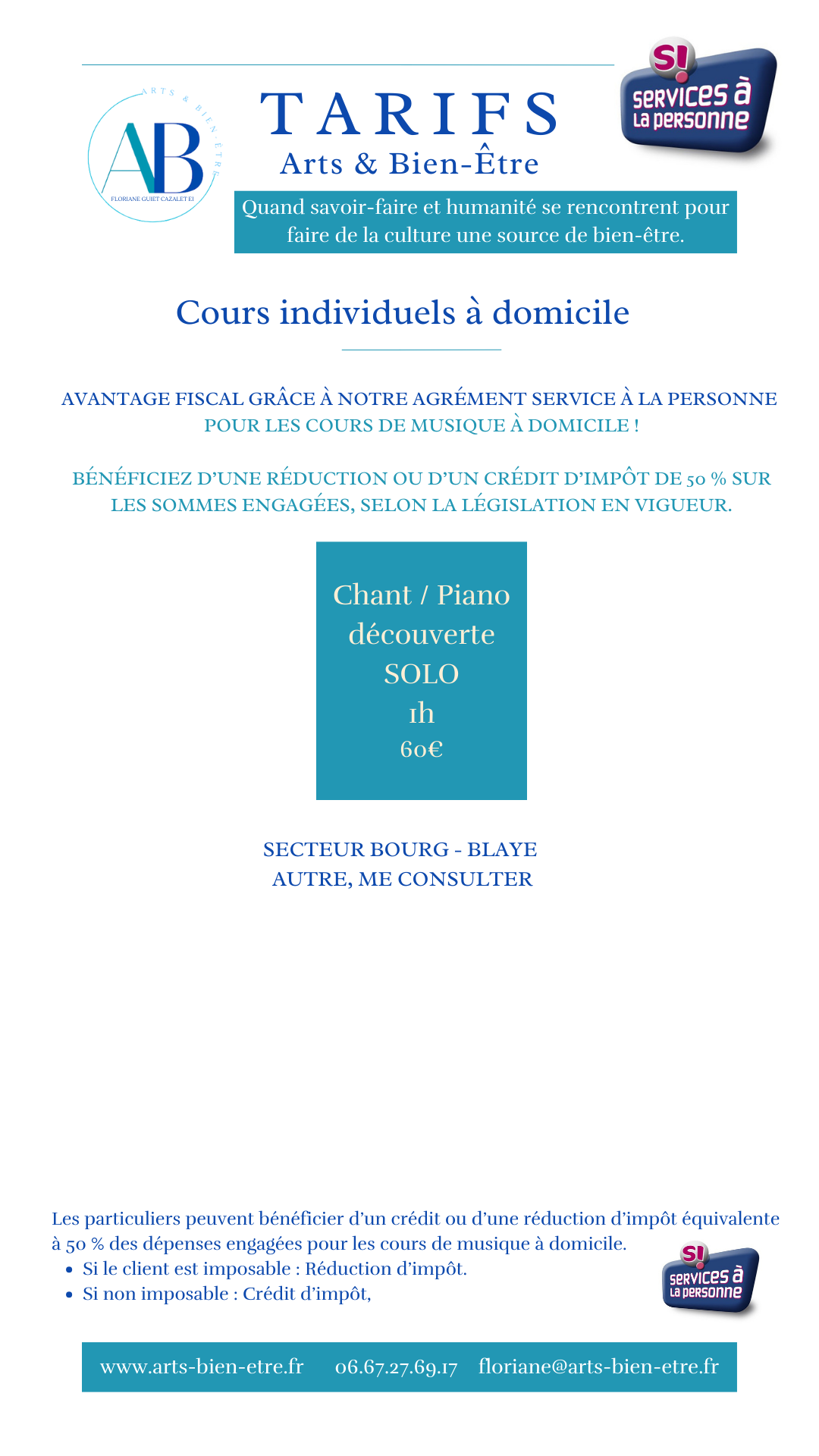 Pour les cours à domicile, vous bénéficiez également de l’agrément Service à la Personne, ouvrant droit à une réduction ou un crédit d’impôt de 50 % (selon la législation en vigueur).